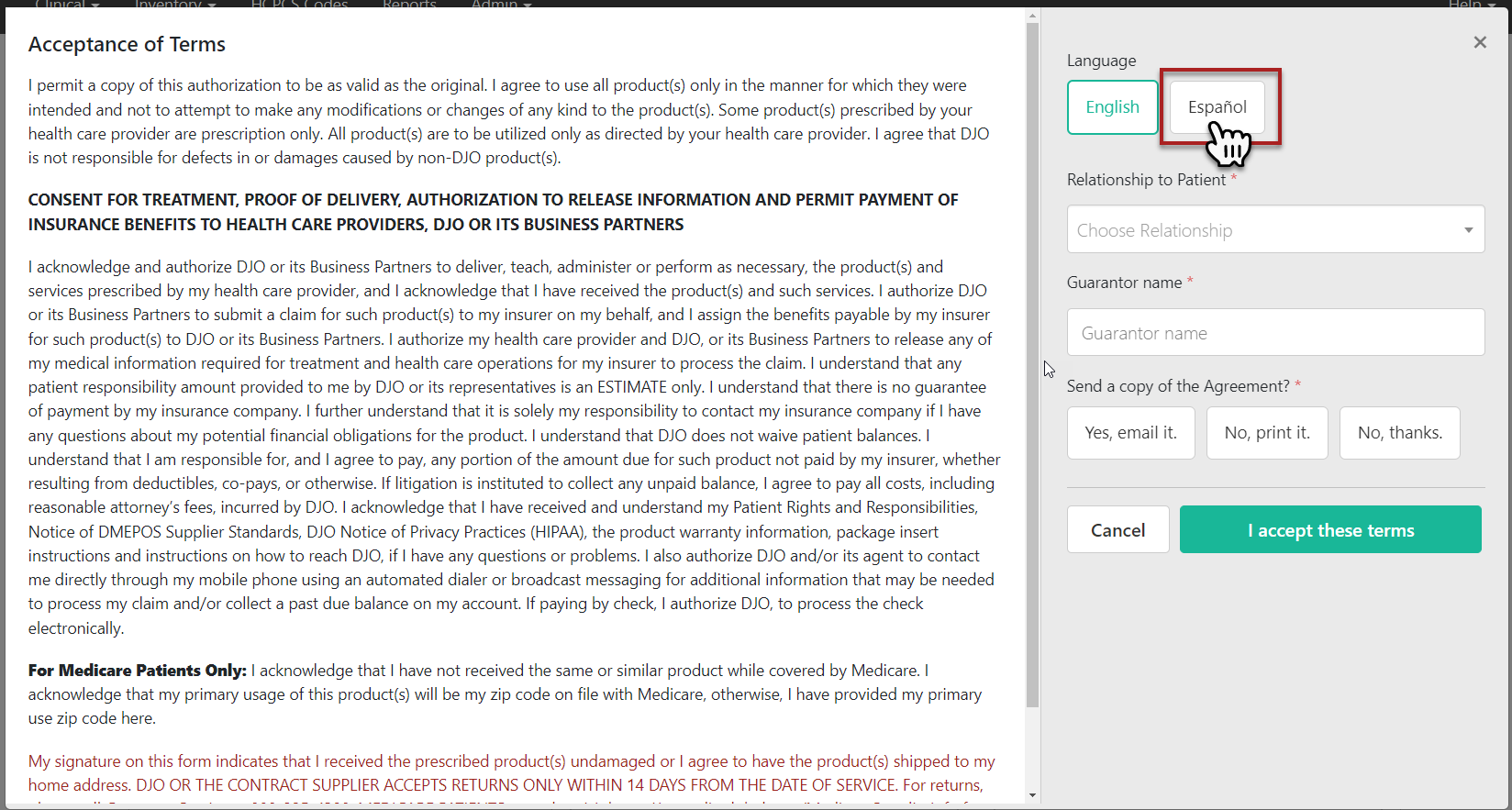 Once enabled, users will select ADD SIGNATURE on the Patient Agreement and the acknowledgements box will appear. Users will have the option to select Language. Click on ESPAÑOL to covert language to Spanish.