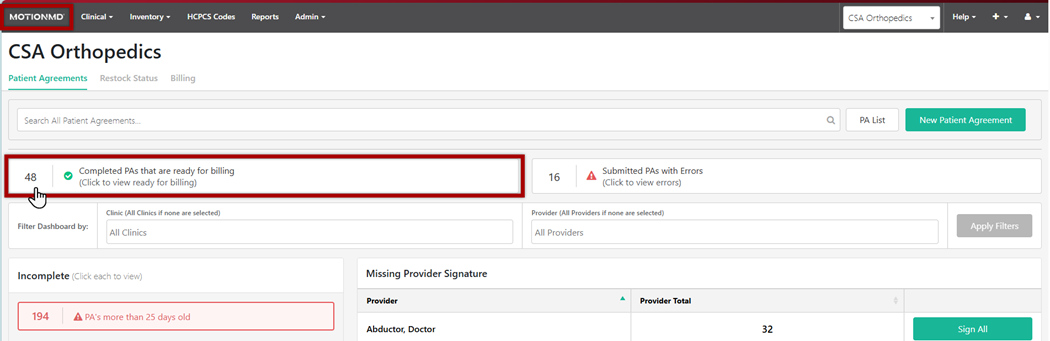 On the MotionMD Dashboard, go to Ready for Billing and select View All: