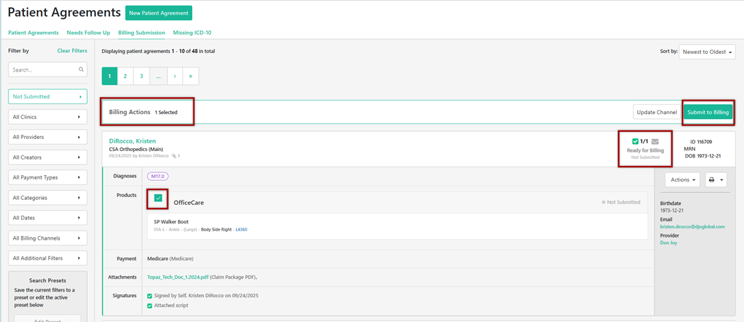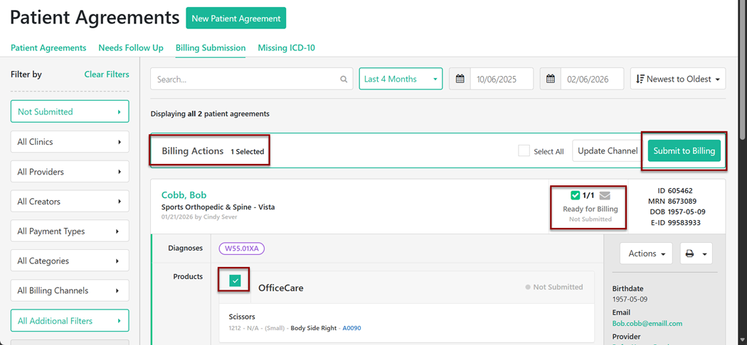After reviewing the claim, select each claim for billing submission. To select claim(s), check the box in the product section by the billing channel. Once all claim(s) have been chosen, the user will select Submit to Billing.