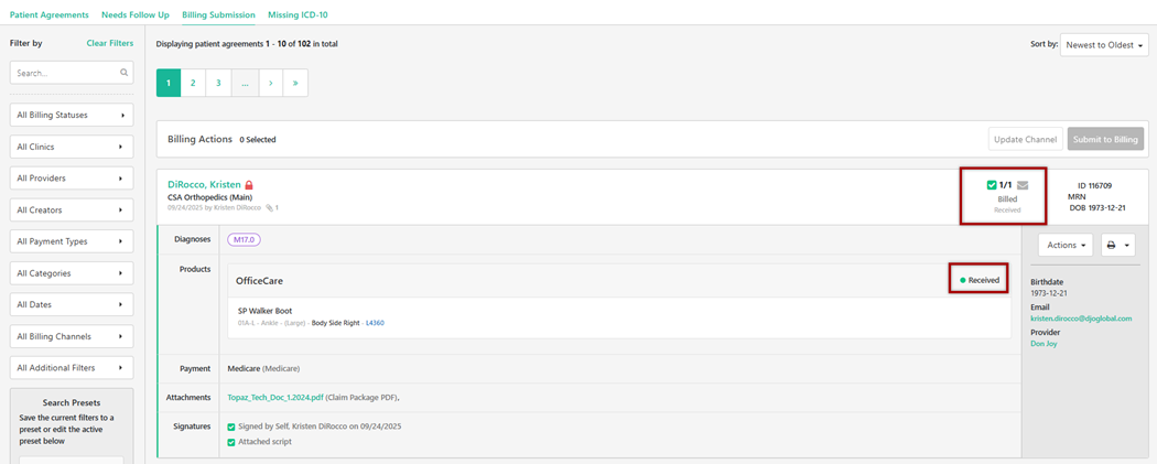 Once the PA has been submitted successfully, a Received status will show on the Billing Submissions page.