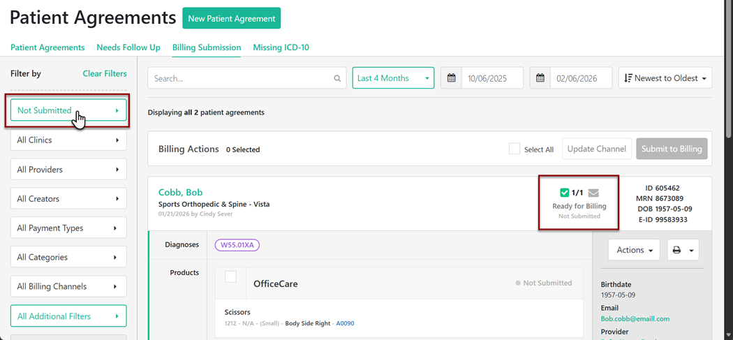 Once in the Billing Submission tab, it will auto-default to Not Submitted claims. Utilize the filters to search for specific claim types as needed.