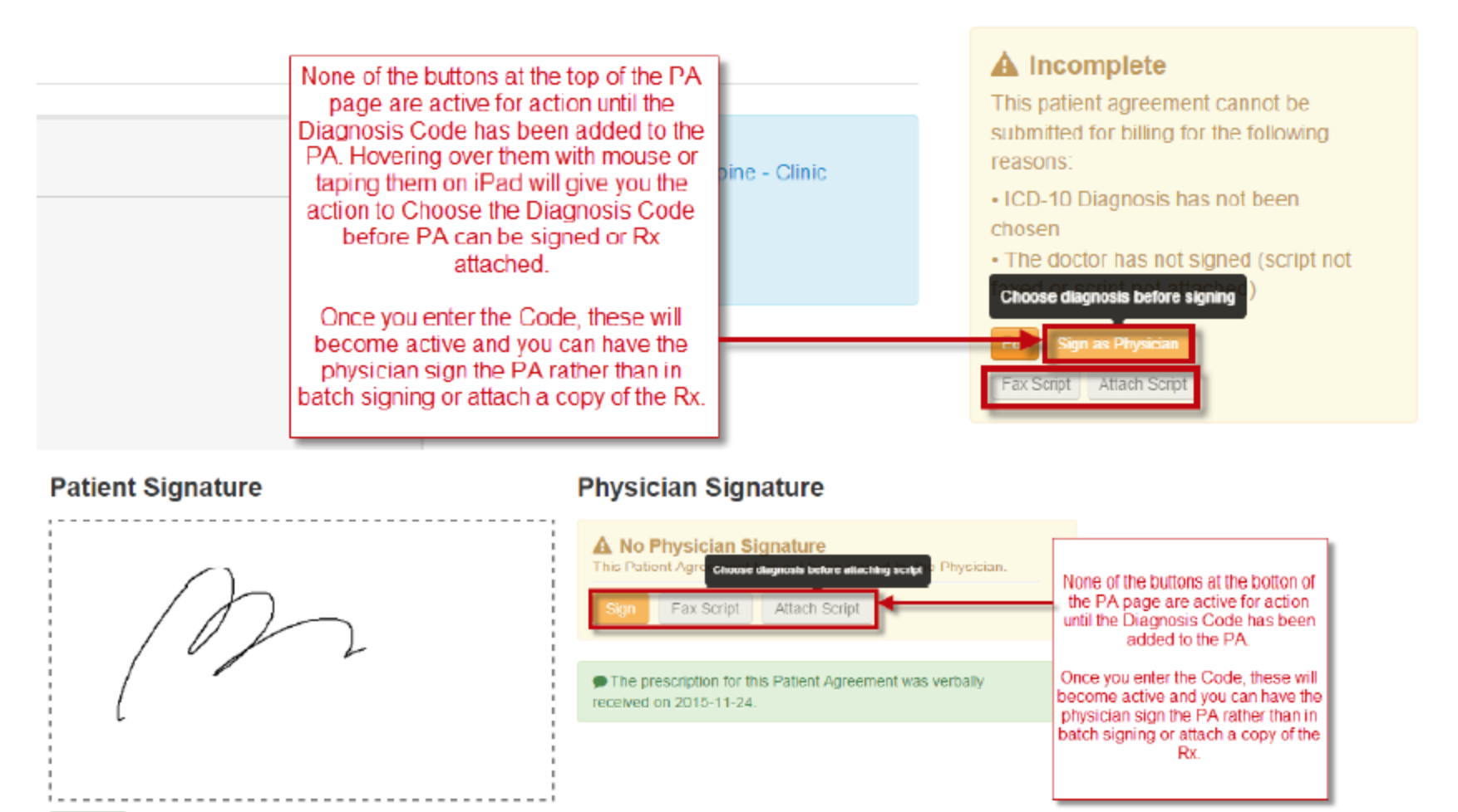 - [Feature] Doctor’s cannot sign without a diagnosis in accounts with locking enabled. (This feature will prohibit the healthcare provider from signing the PA on the PA page without the diagnosis code being entered)