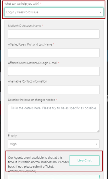 In the Help Ticket Form, there is an option for users to Live Chat with a Customer Success Team member. The Live Chat button is available when Login / Password Issue or Patient Agreement Change are selected in the ticket form.