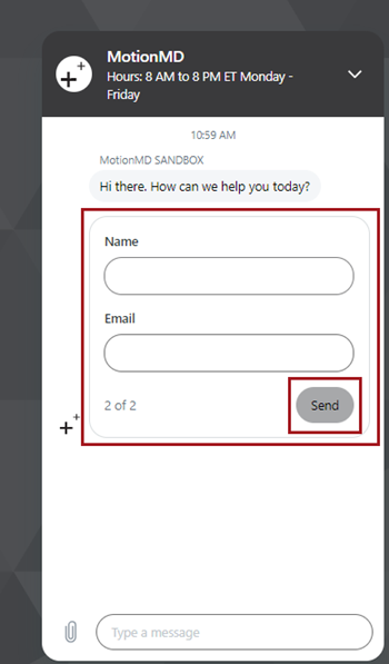 Upon clicking the Live Chat button, a modal opens asking for Name and Email Address. Once those are entered, the User will click Send and the Live Chat process will start with a member of the Customer Success Team.