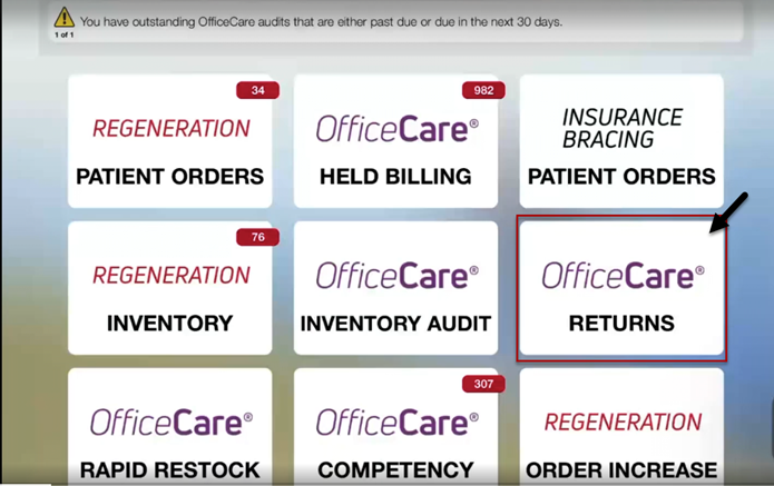To begin an overstock return, open the OfficeCare Returns module in the Beacons App.