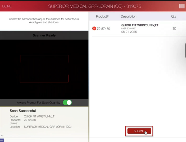 Select the account you want to process the overstock return for and begin scanning the product(s) being returned. Select Submit once all products are scanned.
