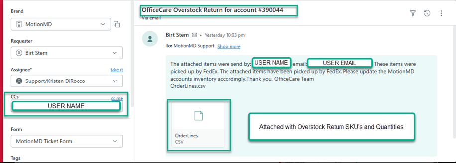 Once the overstock packages are scanned for pick-up by Fedex, an Automated email will be sent to support@motionmd.com with details of the overstock return, see example email below: