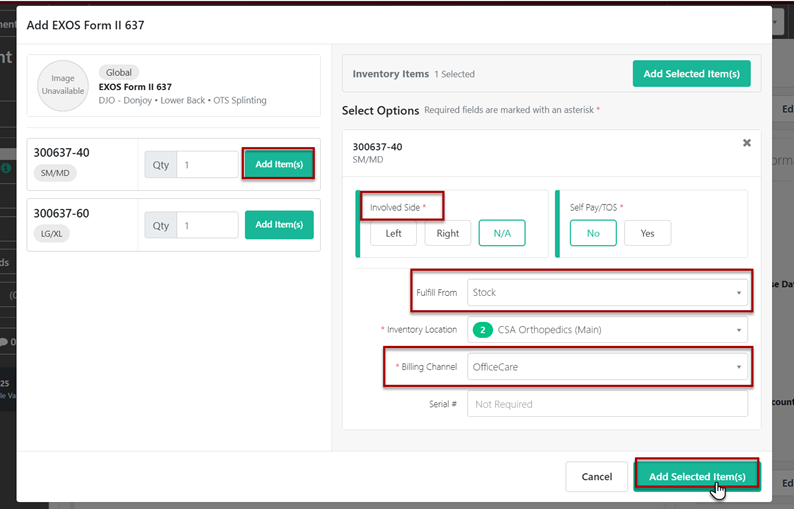 A pop-up box will appear to Add Item(s) and select the Involved Side. The Fulfill From should be set to Stock and the Billing Channel as OfficeCare. Once completed select Add Selected Items(s) to add the product to the PA.