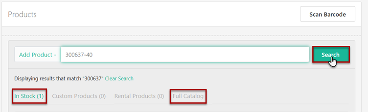 To add a product, start typing the SKU or Product Name and select Search. If there is an existing stock record, the product will display for you to select. If the product does not appear, search the Full Catalog to locate the product.