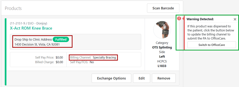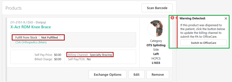 A new Early Warning has been enabled in all OfficeCare accounts called Jump Ball HCPCS Code Early Warning. This Early Warning is designed to show a warning on the Patient Agreement if a product with one of the designated Jump Ball HCPCS codes has been added to the PA: L0627, L0642, L1832, L1833, L3760, L3761 and has a Billing Channel of Specialty Bracing (IB Channel). RCM is requiring that any PA with a Jump Ball HCPCS code and the product was dispensed at the time of service to be routed to OfficeCare. PAs with a Jump Ball HCPCS code and the product was not dispensed at the time of service should continue to be routed through the Specialty Bracing Billing Channel (IB Channel). The warning will include a button allowing Users to quickly update the product to the OfficeCare billing channel if the product was dispensed.
