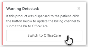 In this scenario, if YES, the product was dispensed, click the Switch to OfficeCare button in the warning and the Billing Chanel will automatically update to OfficeCare. The Product will be decremented from Inventory when the patient signs the PA.