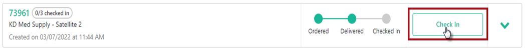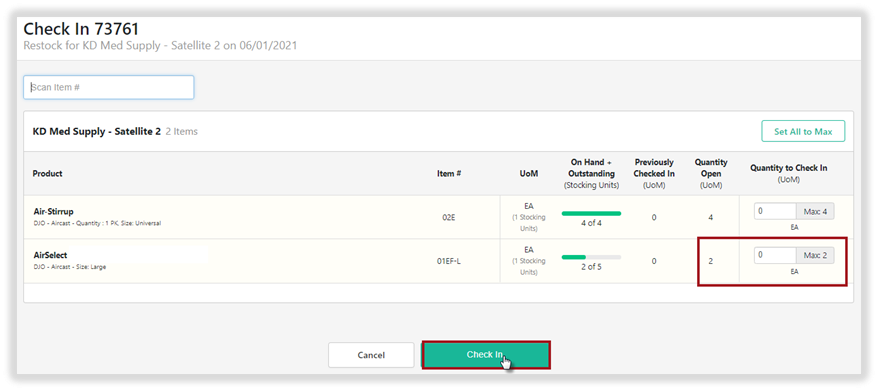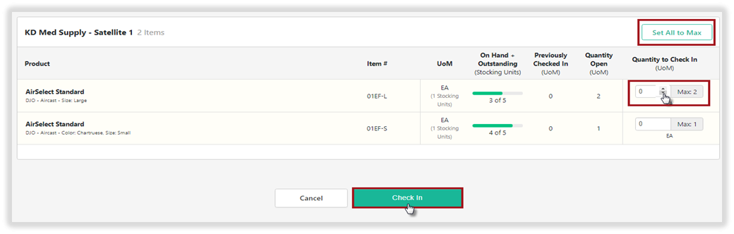 For the Satellite location, click Check In to view all products on the order. If all quantities and products were shipped and received, select Set All to Max and Check In. If a partial shipment was received each product can be manually adjusted to the quantity received and Check In. The order will remain open until all items have been Checked In.