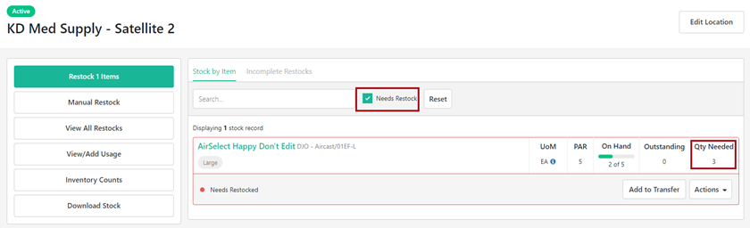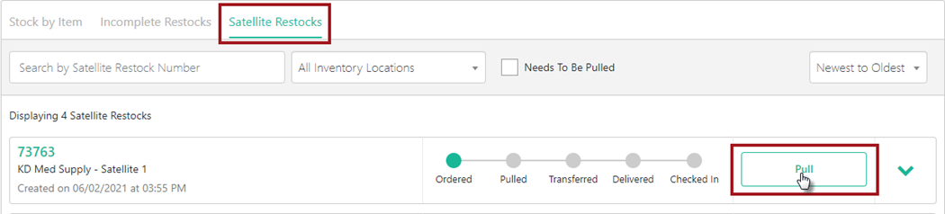Note: Restocks can be cancelled by the Satellite or Warehouse location up until the time they are Pulled by a User in the Warehouse.