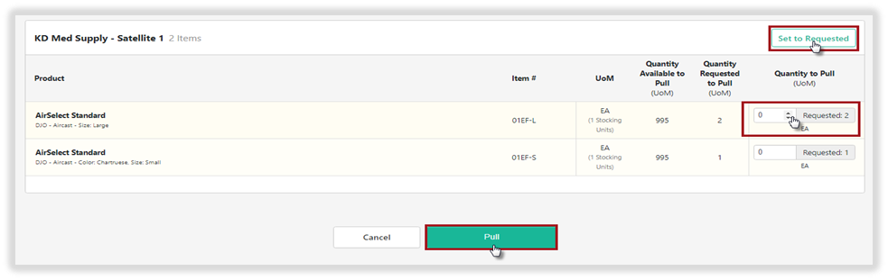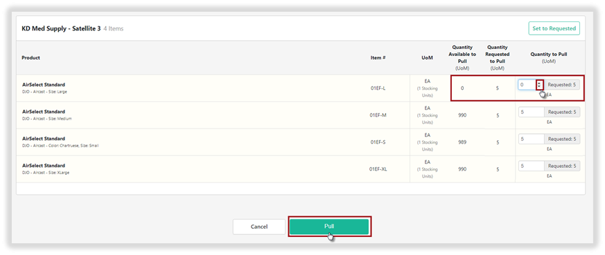 Once Pull is selected, the Warehouse is able to preview the requested product and quantities for each order. Select the Set to Requested to auto-populate all requested quantities or manually adjusted quantities requested.