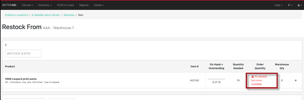 The Warehouse User can view the quantity available to pull from the Wearhouse. If the quantity requested is greater than the quantity available, an error message will show.