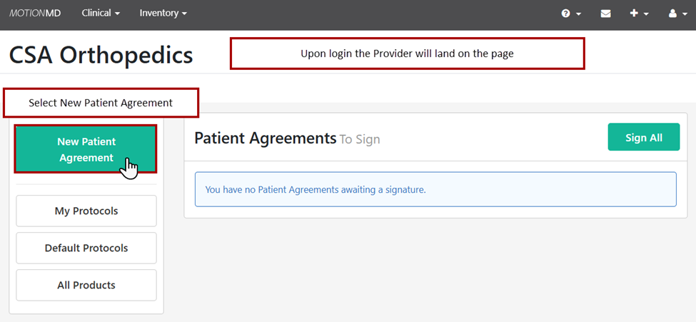 A provider assigned the External Provider Role can log into MotionMD and create patient agreements.