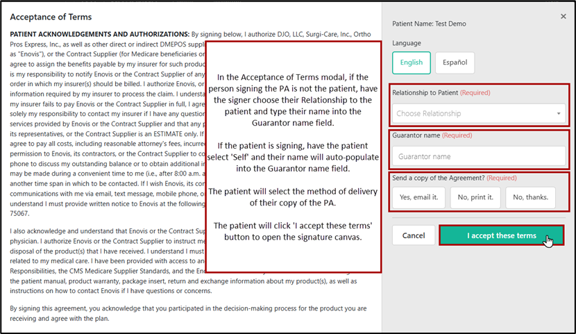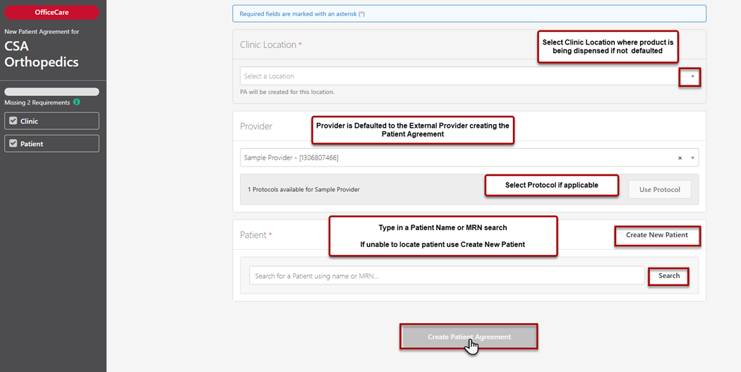 Steps Outlined: Create New Patient Agreement> Add Patient > Add Product > Add Patient Signature > Add Provider Signature